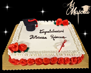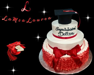 TORTA DECORATA CON PANNA FIOCCO ROSSO E TOCCO DI LAUREA.